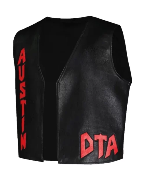 The Stone Cold Steve Austin Black DTA Vest is definitely one of the statement pieces in any gear. Symbolizing rebellion, attitude, and dominance, Made from high-grade leather with added durability and comfort, this vest will go marvelously as casual wear and for a special occasion. The open-arm styling permits ample freedom of movement, while the patches of DTA give off a vibrant and edgy feel. Truly one trendy and impossible-to-pass piece for any wrestling, motorcycle, or just plain rugged fashion lover out there.